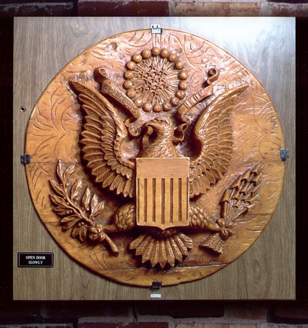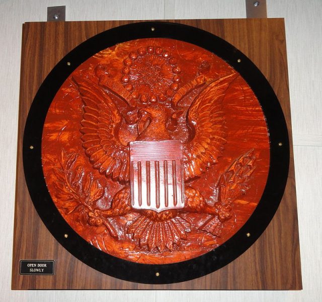 It was on August 4, 1945, that ambassador Averell Harriman received the gift. Harriman apparently liked the elaborate replica so much that he decided to hang it on the wall of his office, where it stayed nearly seven years and survived three more ambassadors: Walter Bedell Smith, Alan G. Kirk, and George F. Kennan, all of whom kept it on the wall of the office. Far from being a gesture of goodwill, it provided the Soviets with crucial information about the post-war activities of the United States until 1952, when an inspection revealed that the bald wooden eagle had been bugged.