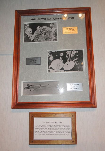 Bezjian was apparently not satisfied with the results of the previous investigations and decided to conduct a more extensive search during the fall of 1952. He had his equipment sent earlier and posed as a “house guest” to ambassador George Kennan, but still, he was unable to locate the bug. Not willing to give up, Bezjian came up with a rather unconventional plan, according to which the ambassador was supposed to dictate an unclassified piece of text to his secretary, Dorothy Hessman, in order to keep the snoopers busy while he searched the office with his receiver. He soon got a signal and realized that the bug was being hidden somewhere behind the hand-carved replica of the Great Seal of the United States, but upon removing the plaque from the wall the signal disappeared, which led him to conclude that the bug had been placed inside the precious Soviet gift.