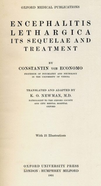 A neurologist from Vienna named Constantin von Economo wrote a paper, “Die Encephalitis lethargica,” in which he gave an extensive description of the illness after witnessing similar cases in civilians. It didn’t take long before his name became associated with the new disease and lethargic encephalitis became known in Vienna as von Economo disease.