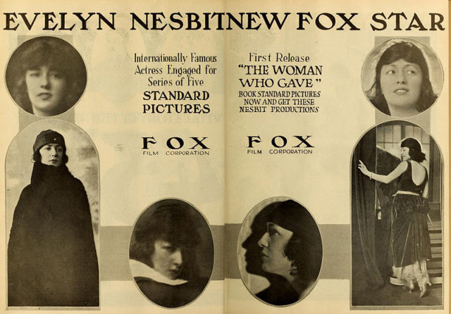 Evelyn gave birth to a son, Russell William Thaw, in 1910, in Berlin. Even though she always maintained that the child was Thaw’s son, conceived during a conjugal visit to Thaw, he denied paternity. They divorced in 1915 and Evelyn married the dancer Jack Clifford in 1916, with whom she worked in a stage act. Their marriage sadly wasn’t a successful one. It seemed that the public didn’t permit her to start a new life, calling her “the lethal beauty,” always associating her with the “playboy killer.” Feeling that his own identity was being subsumed into that of Evelyn’s, Jack left his wife in 1918, and she finally divorced him in 1933.