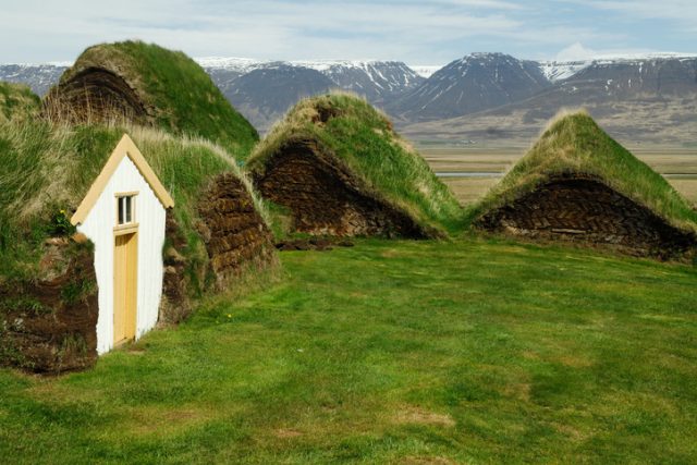 Icelandic turf houses belong to a tradition that was introduced by the Vikings in the 9th century. It has then adapted to the harsh Icelandic climate, providing superior insulation. Seen today, turf houses are green-cloaked homes with grass on the roofs that are laid into the natural landscape.