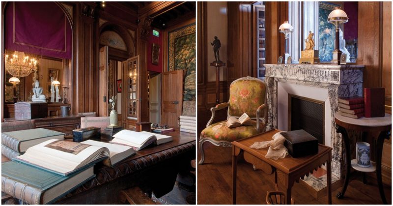 The study and dining room were fashioned in the style of Louis XVII and the bathroom, complete with modern fixtures such as a flush toilet, hot and cold running water and a shower was completed in the Art Nouveau style complete with stained glass and paintings. The topmost floor was filled with Egyptian artifacts, medieval hardware, prehistoric tools and oil lamps from the Neolithic period. There were also monkey skulls and mounted birds and fish scattered among the many rooms.