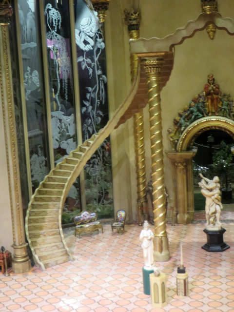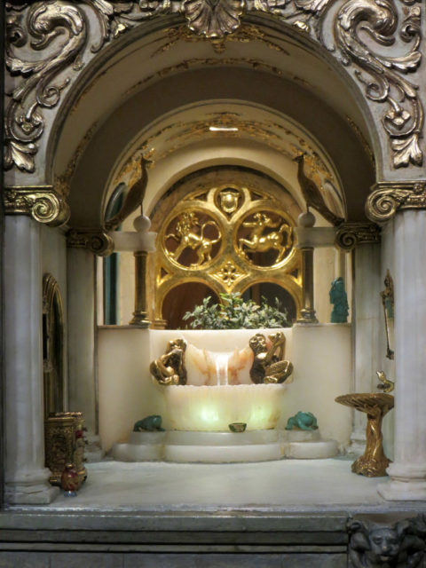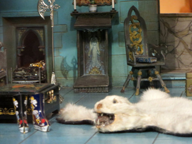 In 1928, with the help of Harold Grieve, former set designer, and architect, Moore constructed the small home of her dreams. And, indeed, she thought small. The dollhouse is nine feet square with a twelve-foot high tower. Yet its interior is filled with most exceptional miniatures and details on which she spared no expense. The house features about 1,500 miniatures, such as bear-skin rugs, designer furniture, and fine art artifacts. Among these pocket-sized treasures is a painting by Walt Disney, a tiny Bible, a replica of King Arthur’s round table, and three statues of the goddess Isis.