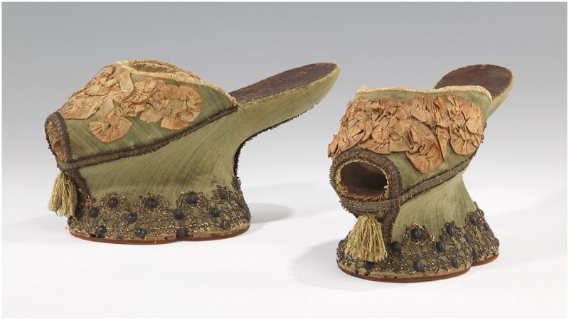 Ornate footwear was often shaped by social conventions–resulting in, for example, Chinese lotus shoes for bound feet–and, in this regard, chopines are definitely worth a mention. These shoes were designed almost 500 years ago in order to show off the wealth and social importance of certain Spanish and Italian families. Reportedly, platforms had a long sartorial tradition in Europe and became really popular during the 17th century, although they have classical Greek and Roman antecedents. Early images of Greek mythology present Aphrodite wearing high platforms, a fashion novelty at the time which was undertaken by the Romans. When the Romans invaded today’s Spain, they established a cork shoe-making industry that was later inherited by the Moors who exported platforms across the region of Maghreb.