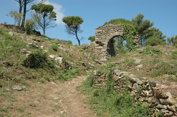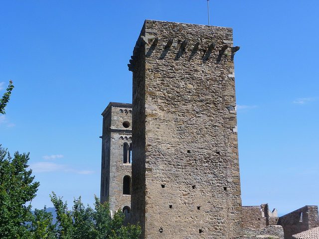 The remains of this medieval town are few. A handful of abandoned houses, two towers, and its crown jewel–the church of Santa Cruz de Rodes (Santa Creu de Rodes in Catalan). All of the structures are built mostly from stone and wood as this is a very old settlement. The two towers are located at the entrance of the town with a clear purpose: to watch for approaching foreigners and for defense. Between the towers there used to be an arched gateway that served as the official entrance to town. The large wooden gate was supported by the arched gateway, constructed of both wood and carved stone. An existing trace of a paved road dividing the town in half and leading straight to the church is still visible.