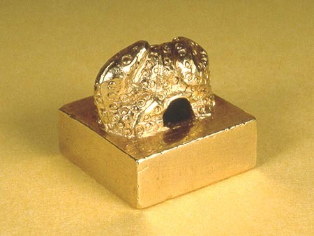 The gold of the seal is of a remarkable 95 percent purity. It is made up of a square base, showing the seal itself on the bottom side. The ancient design also features a handle on the top of the base, resembling the shape of a coiled serpent, and it weights 3.85 ounces. Base to handle, the seal does not extend more than an inch, but the dimensions do correspond to the traditional Chinese standard unit of length, typical for the Later Han Dynasty.