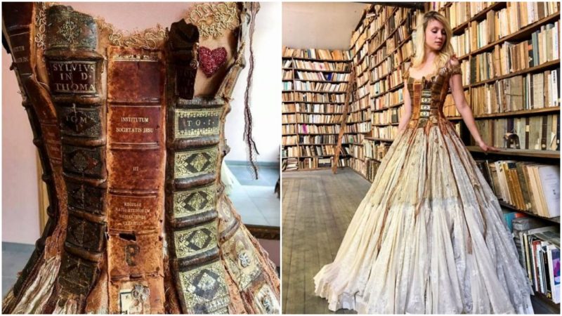 Literary enthusiasts will surely love Facon’s gown with a bodice crafted from the spines of old books. It took her around 250 hours of hard work to finish the gown but all efforts seem to be justified when one sees the final product. The designer assures that the spines had already fallen off the old books before she transformed them into gown materials.