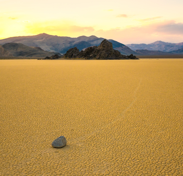 A flat, dried-up lake-bed in the desert landscape, the Racetrack Playa is a peculiar area that stretches some three miles. As the seasons change, so does its surface. During the summer months, the cracked mud could suggest that the terrain belongs to an alien, water-free planet; in winter months, it canĀ be steeled with a sheet of ice. However, it is the dozens of rocks, some of which are small enough to hold in your palm, others as massive as 700 pounds, which raise questions.