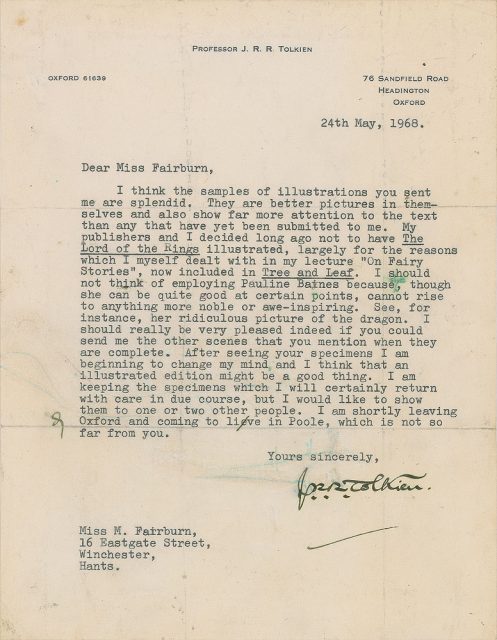 “I decided long ago not to have The Lord of the Rings illustrated,” Tolkien wrote Ms. Fairburn in the first letter, dated May 24, 1968, a one-page machine-typed letter. But then he adds: “After seeing your specimens I am beginning to change my mind.”