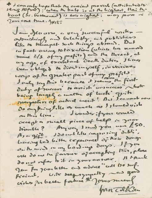 Fairburn was schooled in art and art teaching at London University. It is apparent from Tolkien’s second letter, this one handwritten, that she had explained she was suffering from some financial hardship due to difficulty in finding work. Even though he explains the publishers, Allen and Unwin, deemed it uneconomical to produce a special illustrated edition, Tolkien does offer her a goodwill gesture of £50 “As a gift.”