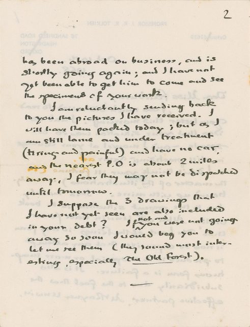 “I am reluctantly sending back the pictures I have received. … I suppose the 3 drawings that I have not yet seen are also included in your debt? I would beg you to let me see them (they sound most interesting especially The Old Forest). By odd chance Mr. Unwin has just rung me up on business, and I had an opportunity of speaking about you. He was not so decisive as I had expected, and was evidently read to ‘consider’ an illustrated edition—but he was also clear that black and white illustrations would be much more likely to prove publishable. My experience is that the process of ‘considering’…takes time.”