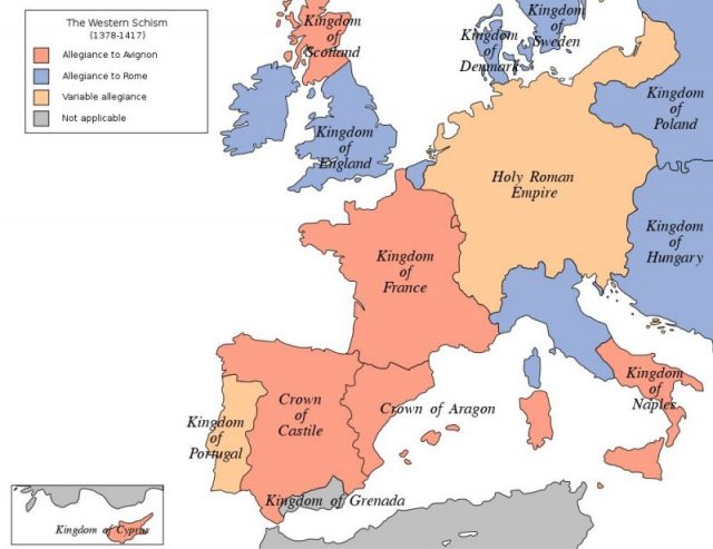 During the late 14th century, this process hit a major hiccup. From 1309 to 1376, the residence of the Pope was in Avignon, France. In total, seven popes lived in Avignon, all French, and therefore all under the influence of the French monarch. But in 1376, Pope Gregory XI left Avignon and returned the papacy to Rome. Unfortunately, he died shortly thereafter, in 1378, and the resulting deterioration of relations between the new pope – Urban VI – and a group of French cardinals resulted in the Papal Schism, also called the Western Schism.