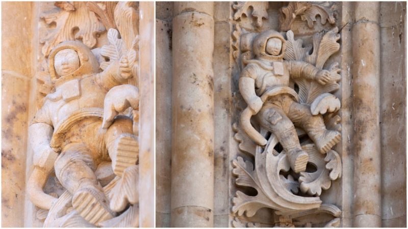 One famous piece of evidence is a photograph of an “astronaut” carved into a 16th-century Spanish cathedral in Salamanca. This cathedral, known as Catedral Nueva, has a strangely modern figure of what looks like a helmet-wearing astronaut on the façade of the entrance.