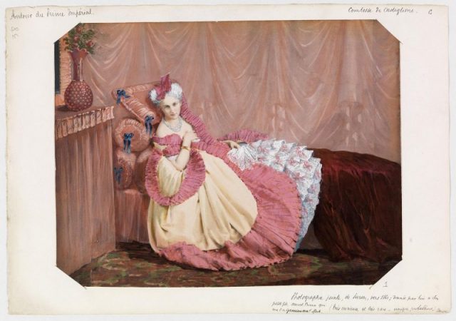 A year after arriving in Paris, La Castiglione began sitting for photographs at the imperial court’s favored studio, Mayer and Pierson, which specialized in hand-painted prints.