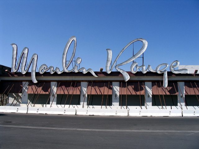 The Moulin Rouge was as extravagant as any complex on the strip. It consisted of a hotel, casino, and theater, all housed in two Googie-style stuccoed buildings. “Moulin Rouge” was written across the façade in pink-neon cursive writing. This sign was designed by Betty Willis.