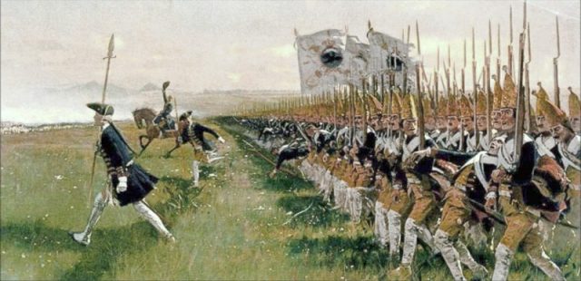 Attack of Prussian Infantry, June 4, 1745 – shown “Potsdam Giants” Grenadier Guards Batallion (1806: No. 6). History Painting by Carl Röchling (1855-1920).