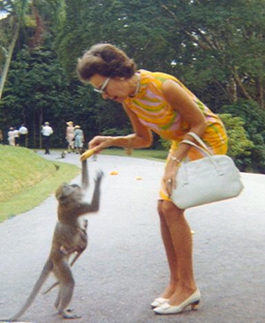 A woman feeding a crab-eating macaque (Macaca fascicularis) at the Singapore Botanic Gardens. CC BY-SA 3.0