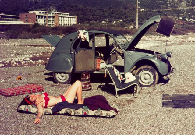 Original vintage colour slide from 1960s, young woman relaxing on a beach with her car.