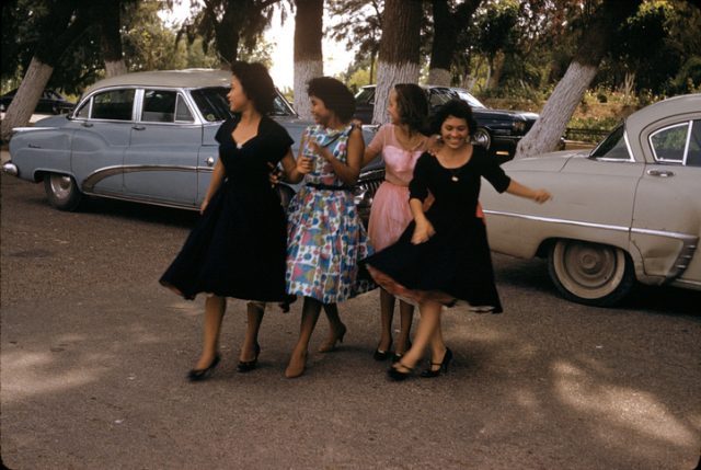 Nuevo Laredo, Mexico, 1960. Four young Mexican ladies crossing a street in Nuevo Laredo.