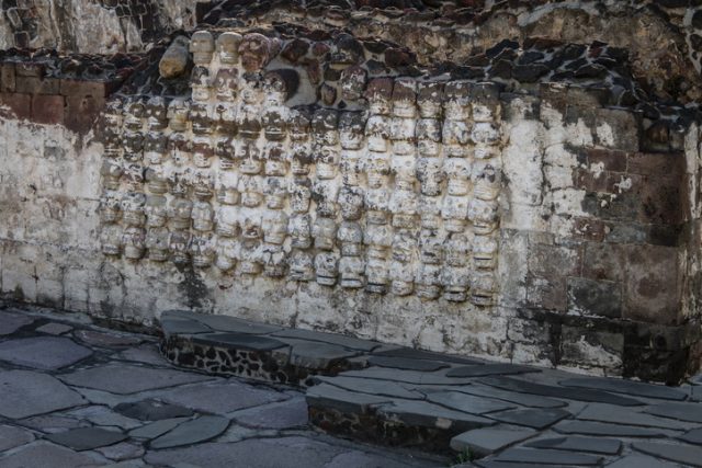 According to the conquistadors, they saw evidence of approximately 100,000 skulls around Templo Mayor, formed into a rack of these poles called a “tzompantli.”