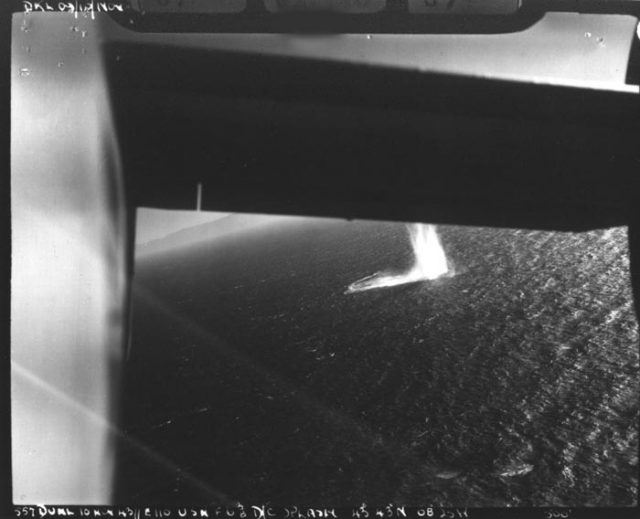 U-966 was badly damaged by a barrage of depth charges from an RAF Wellington, two U.S. Liberator aircraft bombers, and a Czech Liberator as well. U-966 fought back, firing its anti-aircraft gun. One Allied plane was shot down in the fight.