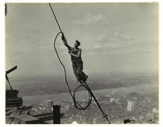 Photographs exist of workers perched on the edges skyscrapers under construction, riveting, welding, doing what they do best, with little to no safety equipment, except perhaps good thick gloves. Hardhats were not even used, let alone harnesses in most cases.