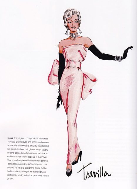 Original Sketch of Marilyn Monroe wearing her pink dress for the musical Number ‘Diamonds are a Girls Best Friend.’ This sketch by William Travilla shows Monroe wearing matching pink gloves.