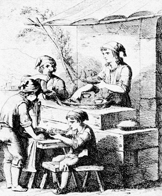 In her drama La Cucina Napoletana, Caròla Francesconi tells the story of a hungry priest who sits down to dinner at a commoner’s house in a poor section of town. After being served by the housewife, he suffocates on a helping of gnocchi after trying to eat it too fast.