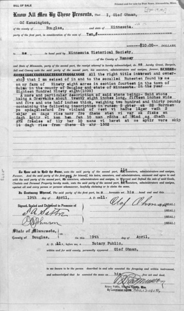 In 1911, Ohman sold the stone to the Minnesota Historical Society for $10, Norwegian historian Hjalmar Holand claimed Ohman sold it to him. Long story short, Holand took the stone to Europe for analysis. Though there was keen debate over the stone’s authenticity, the majority agreed that the text on the front was written in 19th century Swedish, rather than 14th.