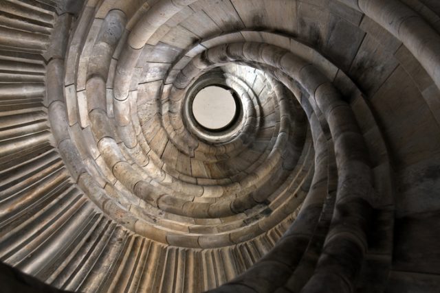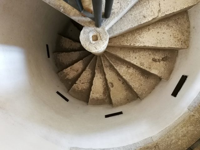 As swords were generally wielded with the right hand, the clockwise spiral gave a distinct advantage to the defenders. The attackers, trying to fight their way up the stairwell, would have to take the narrowing inside edge of the stair in order to swing his sword — and with nothing to hold onto for balance on the curved wall.