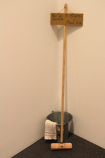 This woman had been busy cleaning the entire building overnight, only to come across the clearly stained trough. Without realizing that it was part of the actual art piece itself, she knelt down, got her scrubbing tools out and went to work.