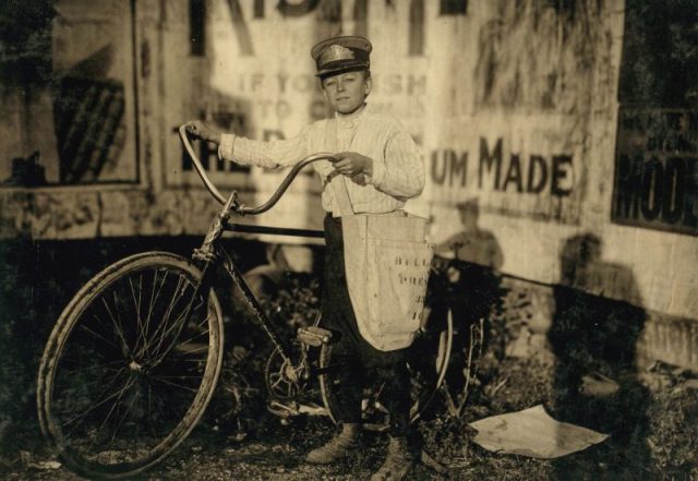 This organization documented poor working conditions in the mining industry, the farming industry and, of course, in the newspaper delivery industry. For example, in 1911, bicyclist Raymond Bykes, who worked for Western Union in Norfolk, VA, claimed that he’d often work past midnight and would sometimes sleep all night by the boat docks.
