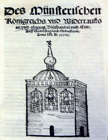 The executed dead bodies of the Anabaptists Jan van Leiden, Bernd Knipperdollink and Bernd Knechting were placed in the iron cages following the religious rebellion in the 16th century. Münster, Westfalen, Germany.