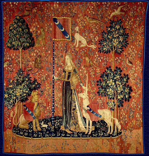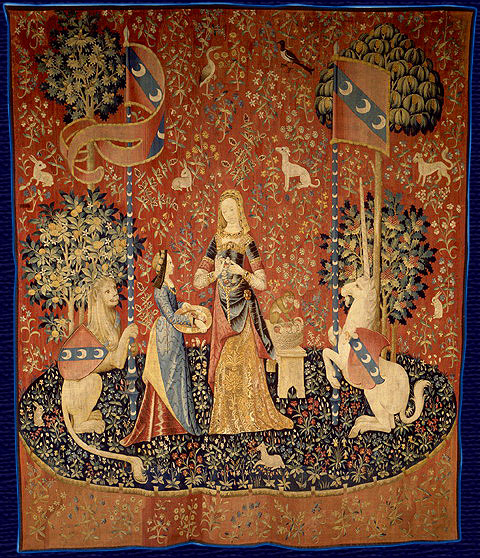 Woven in a “millefleurs” or “thousand flowers” style, the tapestries depict the 5 senses: taste, touch, sight, sound, and smell, with the sixth depicting “à mon seul désir,” literally “my only desire” although it has also been translated as “by my will alone,” “love desires only beauty,” and “according to my desire alone” which has been interpreted as a declaration of independence or even purity.