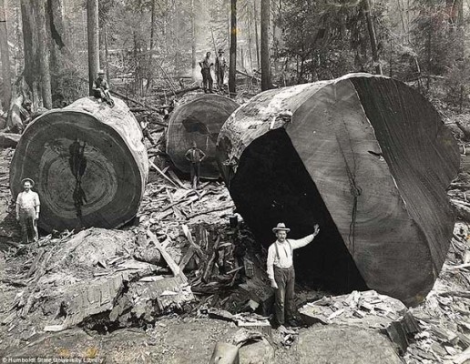 The process took time. The actual felling of a single giant redwood started with building scaffold that enabled loggers to climb up the trunk. Bulky cables and enormous pulleys were also needed to lift up junctions of the trees that weighed dozens of tons.