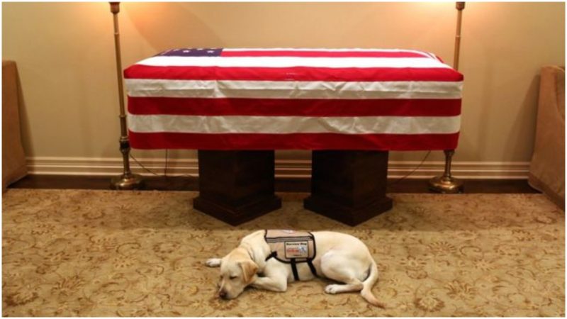 Sully, the service dog of former President George H.W. Bush, spent the night of December 2, 2018, lying before Bush’s flag-draped casket in Houston, Texas.