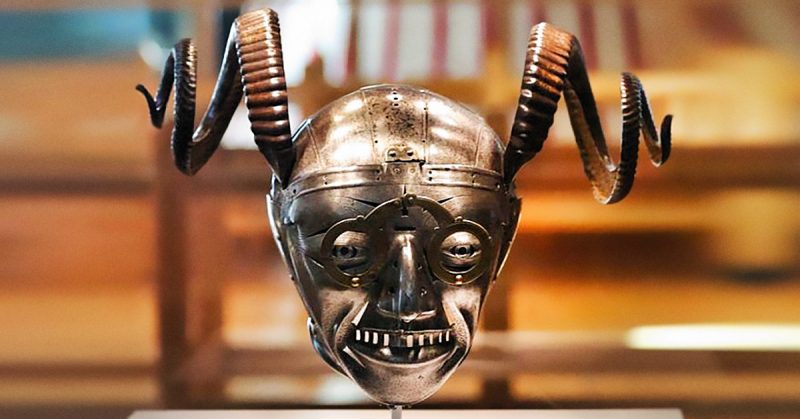 With its spiraling horns, bizarre spectacles, and large nose, the Horned Helmet of King Henry VIII features a beautifully crafted face.