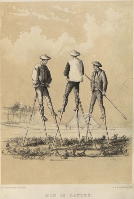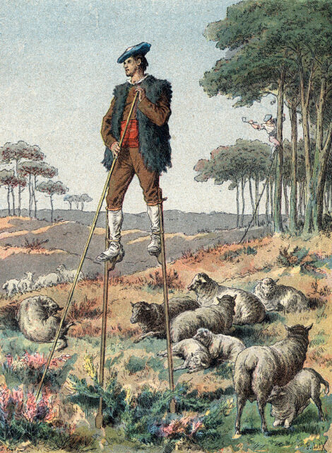 Today, much of the Landes region in southwestern France is a forest, but over a century ago the scenery was different. Instead of an area densely covered with pine trees, there was a vast expanse of swampy terrain as far as the eye could see, without a road in sight. For centuries, the impoverished people who lived there came up with a way to negotiate the unforgiving landscape: walking on stilts.