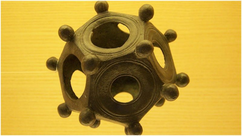 Each side has a hole in the middle, and there are small knobs on each corner of the hollow device. A few have been found made from stone, but the majority of them are made from copper alloy. They date from about the second or third centuries and are known as Roman dodecahedrons.