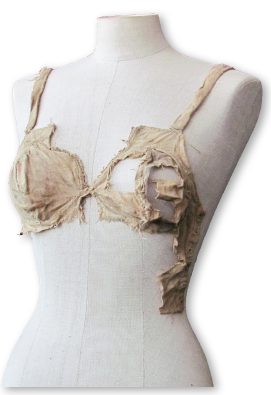 The third garment was elaborately decorated with lace work on the straps and at the lower edges of the cups. It had two broad shoulder straps and possibly a back strap, almost identical to bras in use today. The last bra is similar to the longline bra’s that were popular in the 1950s. It features narrow shoulder straps and two linen cups sewn together. The fabric extends to the bottom of the ribcage with eyelets for lacing it together on the sides, a little like a soft corset.