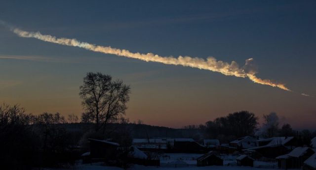 On February 15, 2013, a meteor exploded in the area of Chelyabinsk, Russia, a city of over one million people in the southern Ural Mountains. For a moment brighter than the sun in the sky, the meteor was a literal fireball, scientifically called a “superbolide,” and entered the atmosphere at an estimated 40,000 miles per hour. Though it looked like it exploded much lower, the fireball blew up at a height of 18.5 miles. It pushed a cloud of atmospheric gas and dust to a height of 16 miles. Many meteorites survived the blast and fell to Earth.