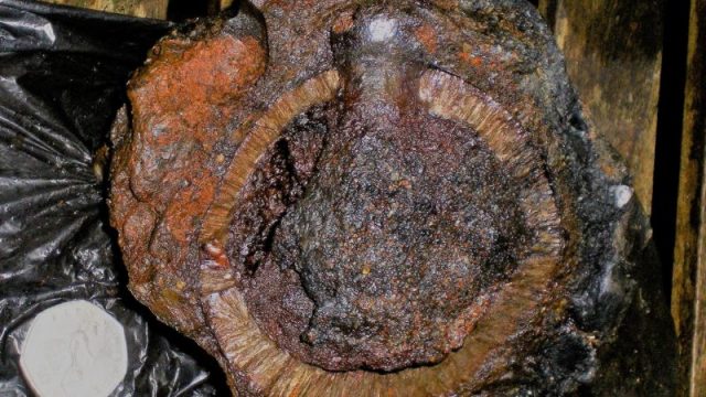 Both objects were heavily encrusted after lying on the seafloor for more than 300 years, and “Felce said he at first thought the latest grenade was an ordinary rock until he slipped and dropped it, and it broke open, revealing the two halves of the metal weapon and the explosive powder inside.”