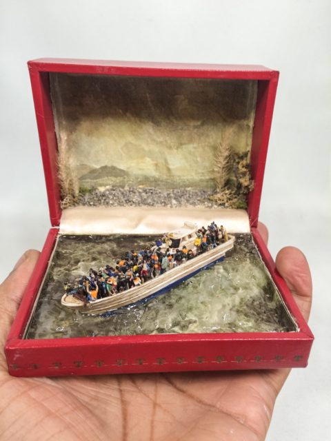 The vendor asked the artist if he could make something out of it, and Talwst immediately answered. He took a miniature figure and placed it inside the box which was covered with a seascape visual, so it appeared as if the figure was coming out of the sea.