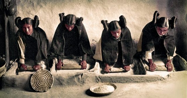 Four young Hopi Indian women grinding grain, c. 1906 – photographed by Edward S. Curtis.