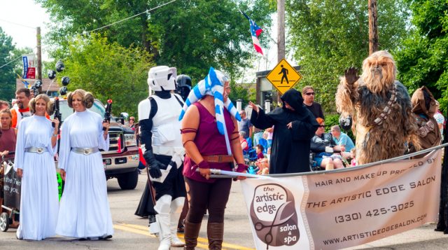 Twinsburg, OH, USA – August 8, 2015: Twins and others dressed as characters from Star Wars walk in the Double Take Parade, part of the 40th annual Twins Day festival, the largest gathering of twins in the world.