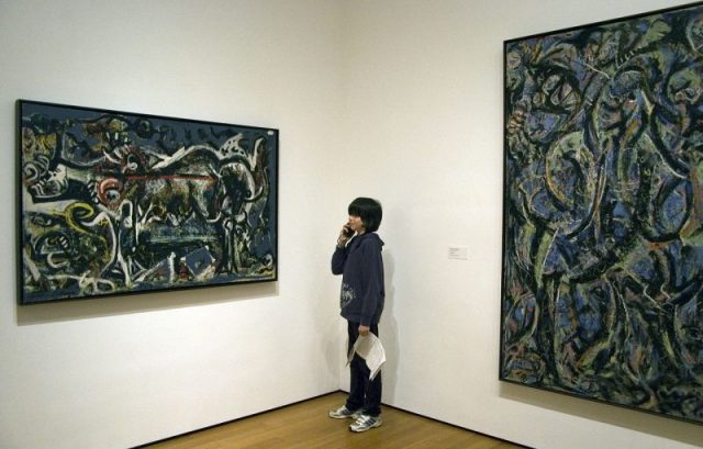 Pollock’s method, according to the website of the Museum of Modern Art, “consisted of flinging and dripping thinned enamel paint onto an unstretched canvas laid on the floor of his studio… His works, which came to be known as ‘drip paintings,’ present less a picture than a record of the fluid properties of paint itself.”