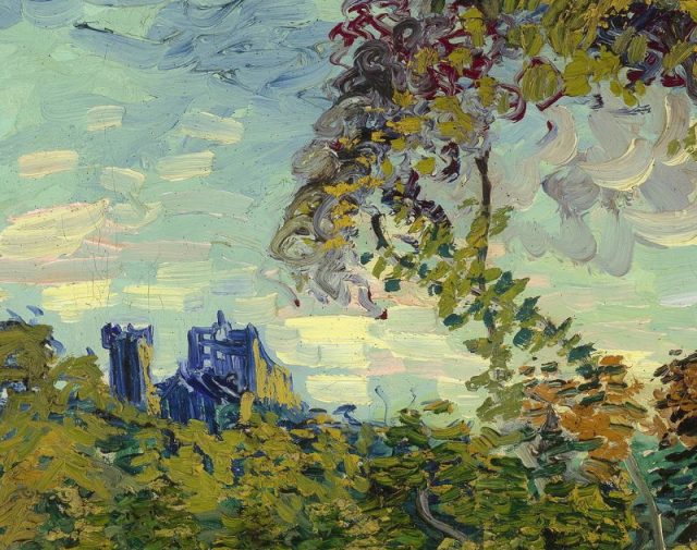 As described on the website vincentvangogh.org, “The painting depicts dusk in the hilly, forested landscape of Montmajour, in Provence, with wheat fields and the ruins of a Benedictine abbey in the distance. The area around Montmajour was a subject that van Gogh revisited often.”