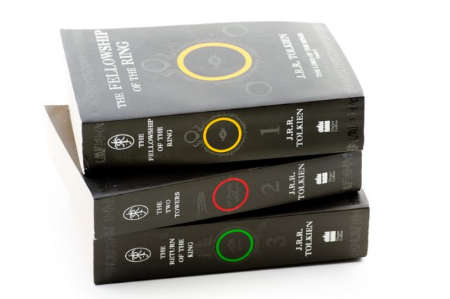 J.R.R. Tolkien’s epic fantasy trilogy The Lord of the Rings, which includes The Fellowship of the Ring, The Two Towers, and The Return of the King. These paperback editions were published by HarperCollins Publishers in 1999.
