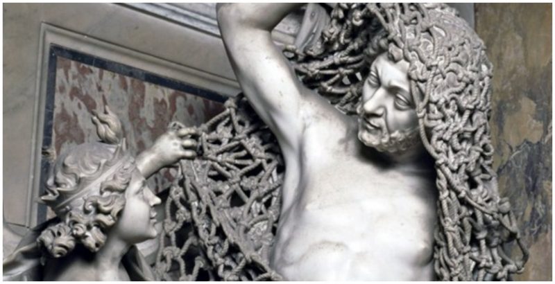 The effect of sheer fabric carved out of marble makes Sanmartino’s work one of the most impressive in the world. The statues which surround the Veiled Christ all represent various virtues. Of these, perhaps the most astonishing is Release From Deception by Francesco Queirolo, also known as Disillusion.