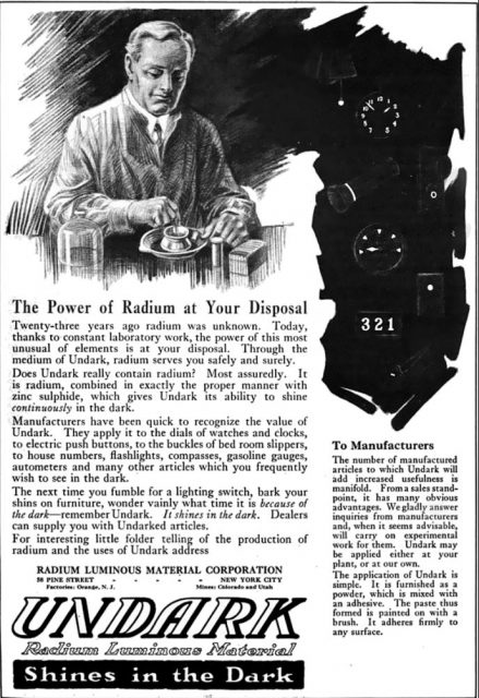 Luminous radium found a place in a dial-painting “studios” where glowing paint was applied to instrument gauges, clocks, and wristwatches for the USRC — United States Radium Company. The first such studios were open in New Jersey, Newark, Illinois, and in Ottawa, Canada.